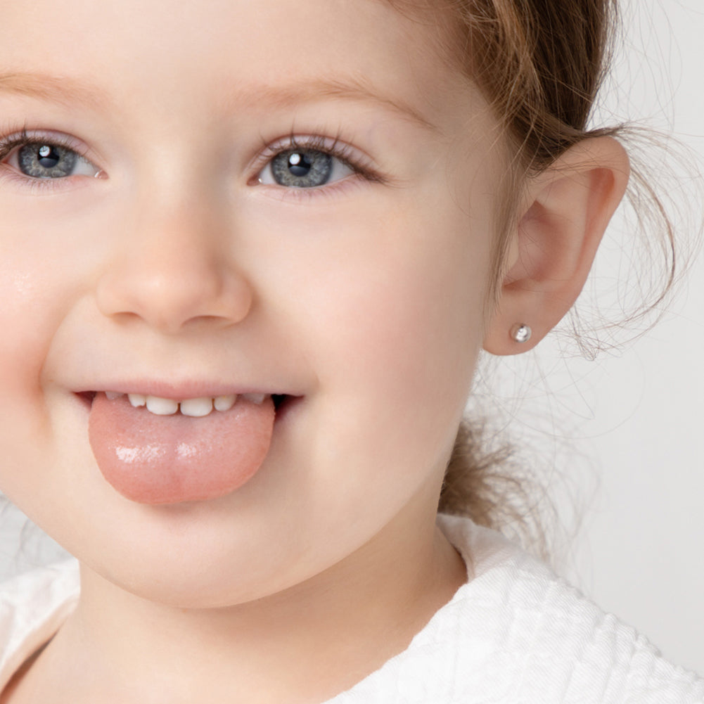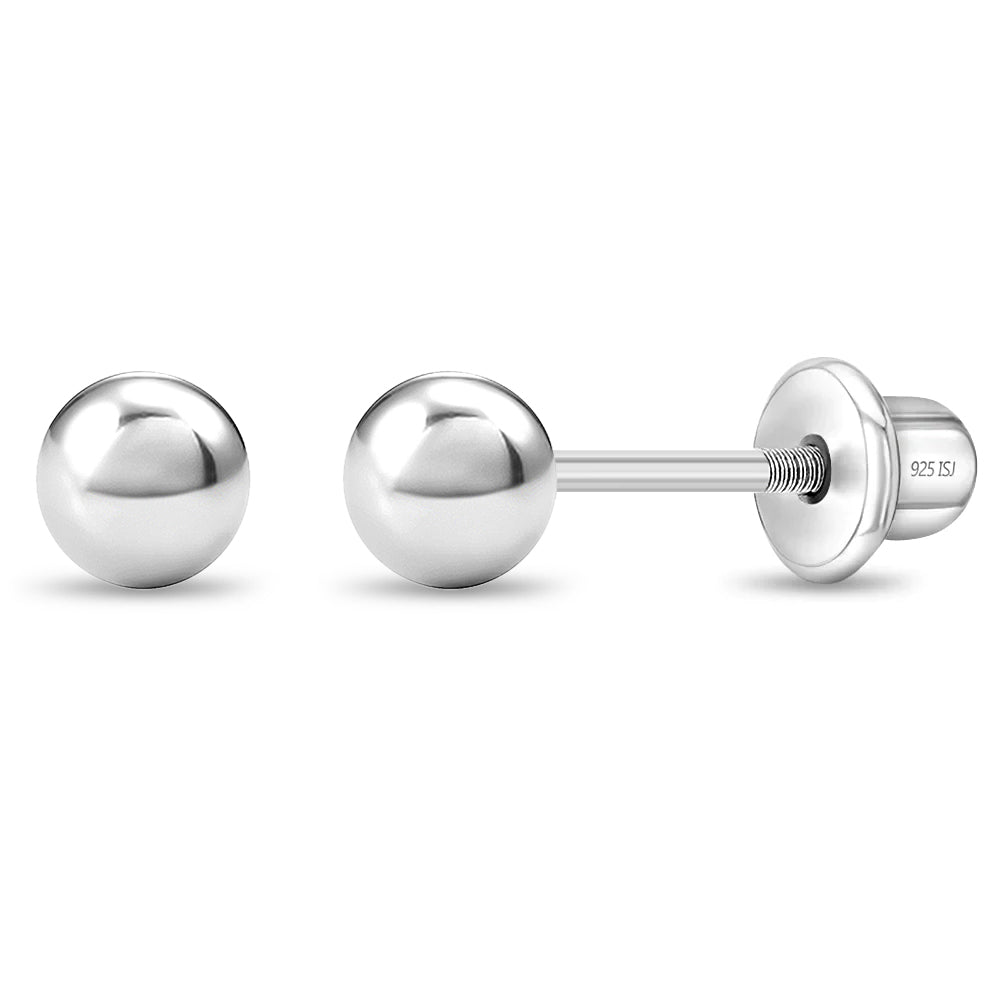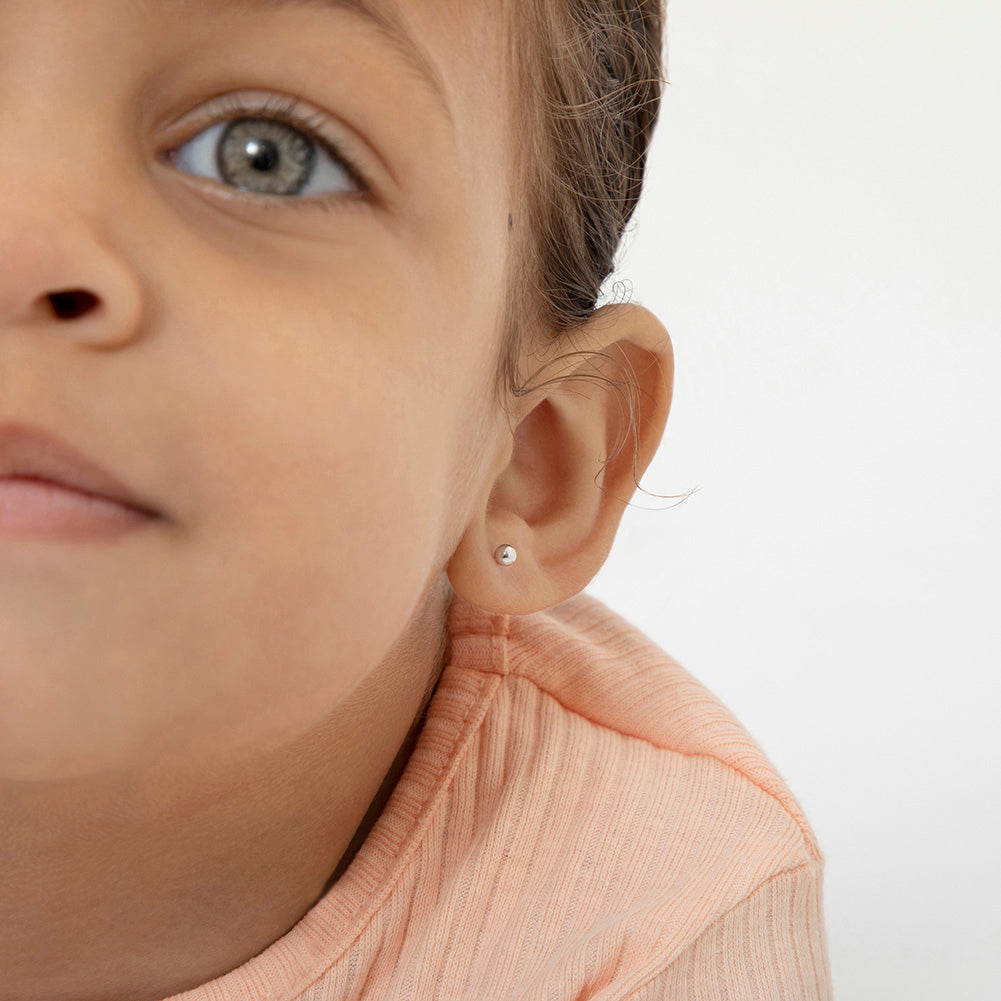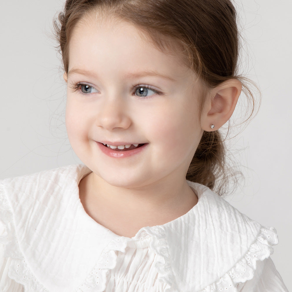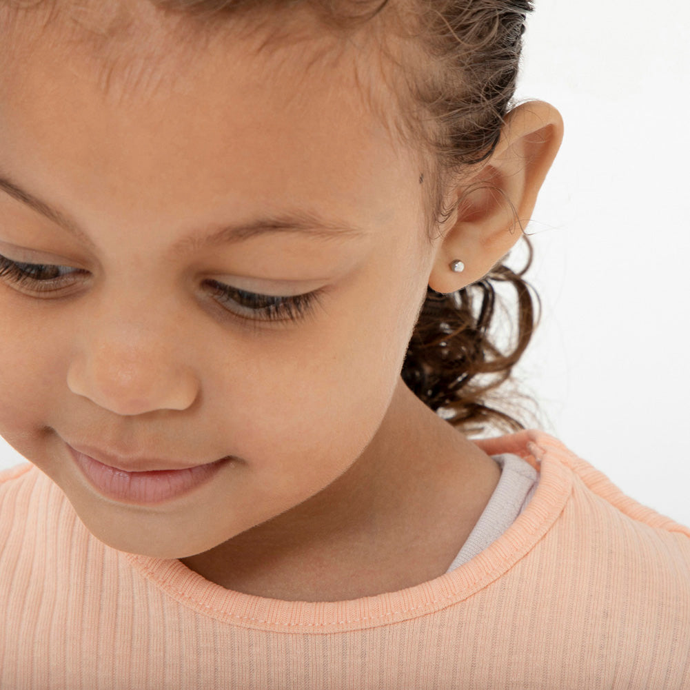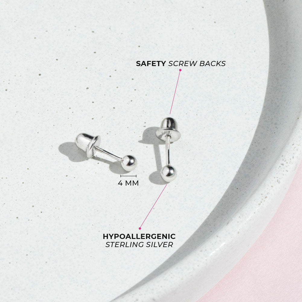Classic and traditional, these tiny ball earrings are a must-have for any little girl's jewelry box. These timeless children's earrings come in 3mm and 4mm and are crafted entirely in 925 sterling silver, a naturally hypoallergenic precious metal that is safe for sensitive ears. The threaded safety back system is ideal to ensure your child's earrings stay safely and comfortably in place at all times. These cute earrings come with a complimentary gift box for easy giving!