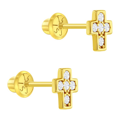 These small screw back 14k Gold cross stud earrings are an ideal way to show off her spiritual side. These beautiful gold cross earrings for girls are petite and make a fabulous choice for toddlers and young girls who'll enjoy wearing religious jewelry. The little five cubic zirconia details of these gold cross studs give them a very dainty appearance. Gift box is included.