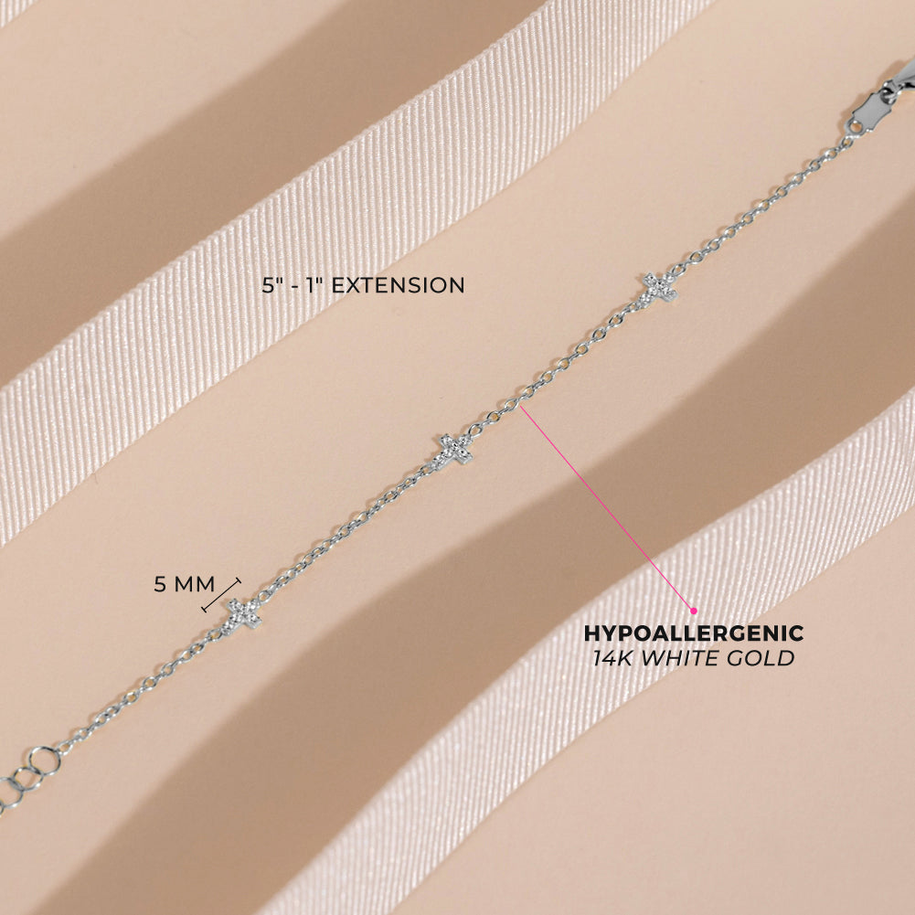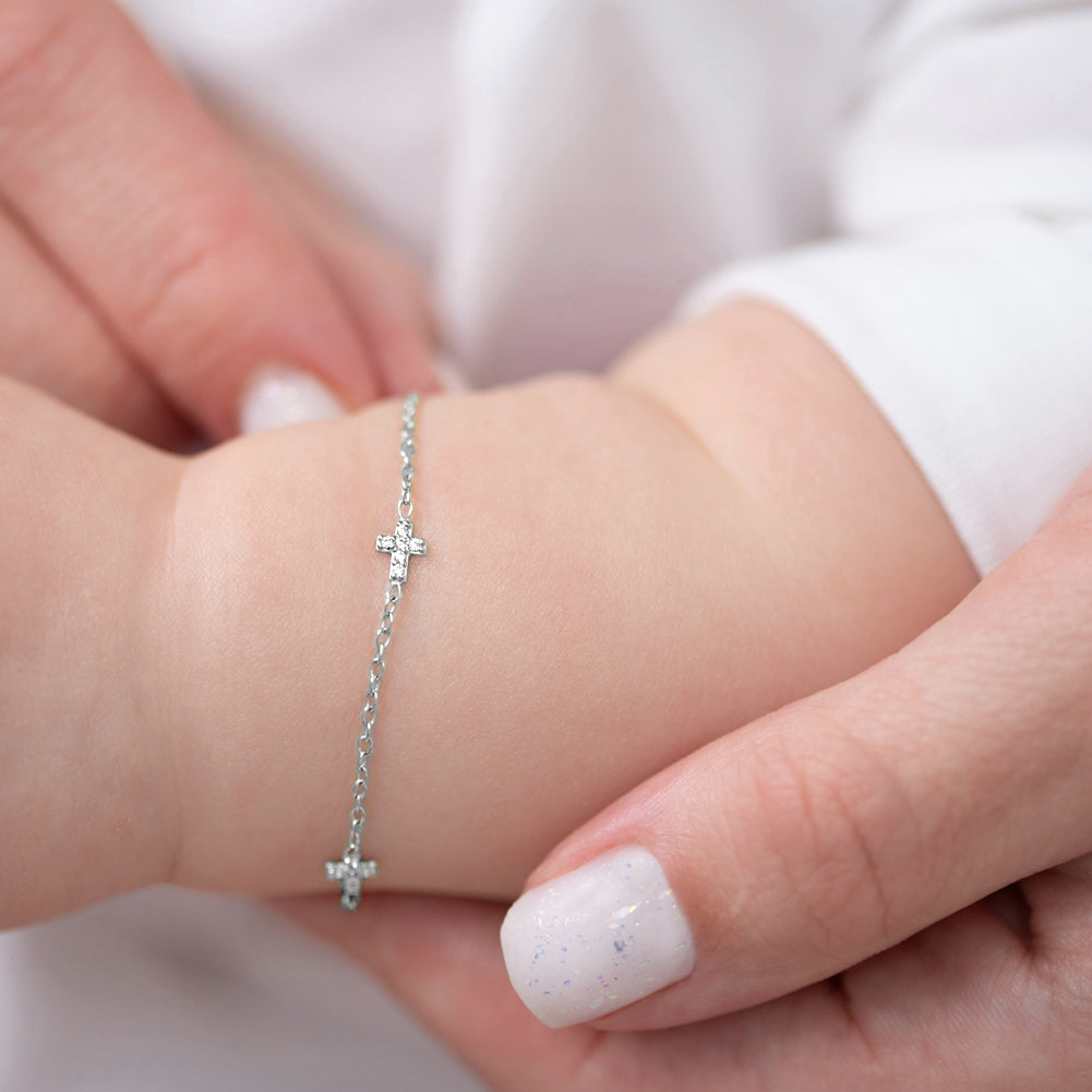 Our divine little girl's bracelet, is a blend of elegance and innocence. Crafted from hypoallergenic 14k white gold, this bracelet features linked crosses adorned with sparkling clear cubic zirconia stones, radiating a celestial glow. With a length of 5 inches and a 1-inch extension, it ensures a comfortable fit as your little one grows. Pairing style with safety, parents seeking a precious adornment for their Childs baptism will cherish this bracelet's craftsmanship and hypoallergenic nature. A gift box is included with purchase.
