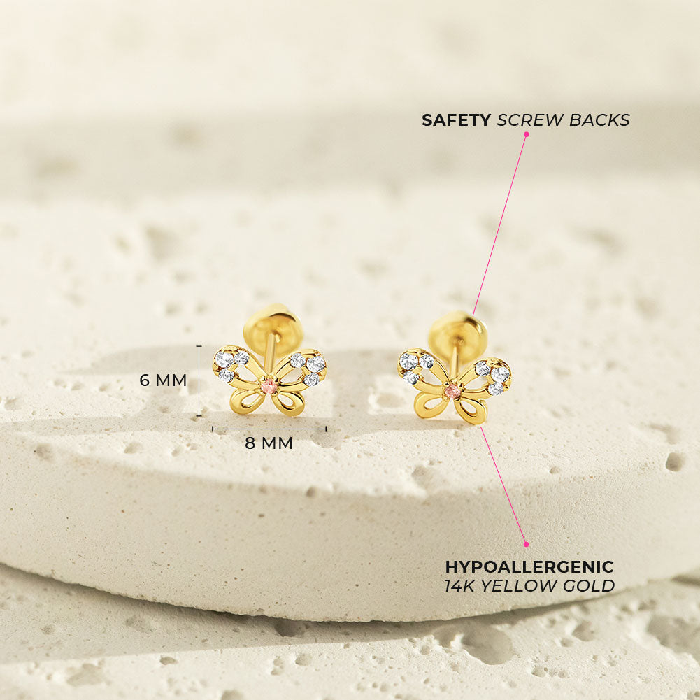 14k Gold Jeweled Butterfly Baby / Toddler / Kids Earrings Safety Screw Back