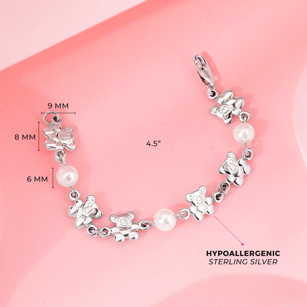 Start your little girl's jewelry collection off right with this charming teddy bear bracelet. Teddy bear jewelry is a cute way to dress up your little girl's outfits for a special occasion or just to show your love for her. You can surround your baby's wrist with the comfort of teddy bears and the sophistication of these simulated pearls in a beautiful sterling silver bracelet that is suitable for sensitive skin. This cute silver bracelet for baby girl will arrive packaged in a small gift box, making it perfect for birthdays or special events.