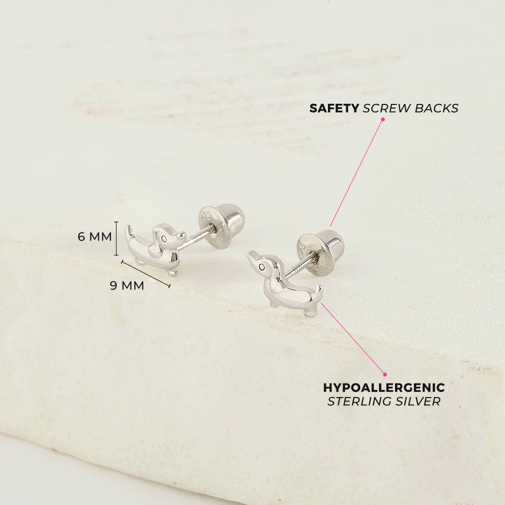 These playful earrings capture the spirit of dapper Dachshund dogs, meticulously crafted from hypoallergenic 925 sterling silver to ensure they are gentle on sensitive skin. Each earring gleams with a polished metal finish, highlighting the delightful details of the Dachshund's silhouette, from their long, elegant bodies to their perky, expressive faces. The safety screw back closure offers peace of mind, keeping these charming accessories securely in place. For young animal enthusiasts, these earrings blend whimsical design with practical safety features, making them a treasured addition to any girl's jewelry collection.