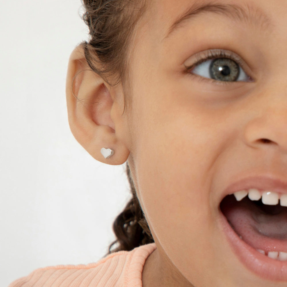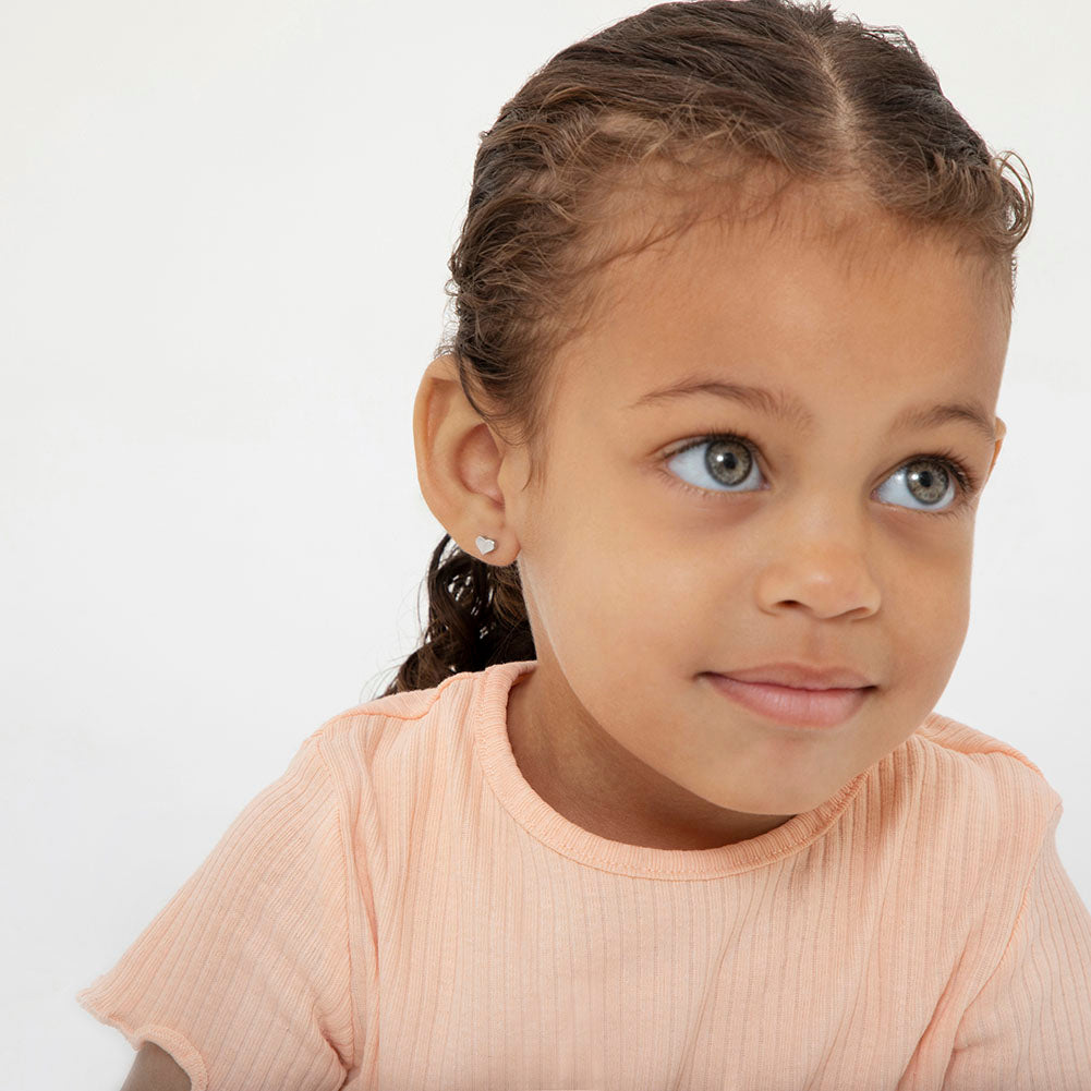 Simple but stylish these adorable tiny heart earrings are the perfect size for your baby, toddler or young girl. Crafted entirely in 925 sterling silver, they are hypoallergenic and safe for children with sensitive ears.They feature a threaded earring post and back to ensure your child's earrings stay safely and comfortably in place. A complimentary gift box is included.