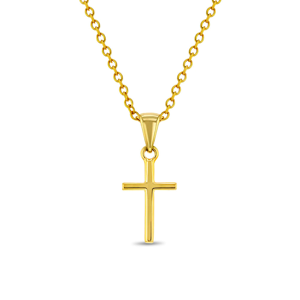 Elevate your little boy's spiritual journey with this exquisite petite cross-shaped pendant necklace crafted from sterling silver. Designed with meticulous care and adorned with a yellow gold flash, it offers both timeless beauty and a hypoallergenic quality, ensuring comfort for children with sensitive skin. This necklace is the perfect gift for significant milestones like First Holy Baptism, Christening, First Holy Communion, First Reconciliation, or Confirmation. It comes complete with a matching 16" sterling silver chain, and we've taken the extra step to package it beautifully in a complimentary gift box, making it a cherished keepsake.