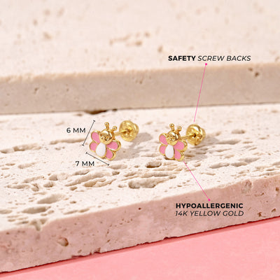 A beautiful pair of unique butterfly earrings that was specially crafted with your little girls style and comfort in mind. Made from 14k yellow gold and with sweet pink and white enamel details, this delicate pair of earrings are ideal for a toddler girl. These screw back earrings for toddlers make a thoughtful gift for birthdays or any other special occasion. These earrings also features safety screw backs, making them suitable for children with sensitive skin. Gift box included.