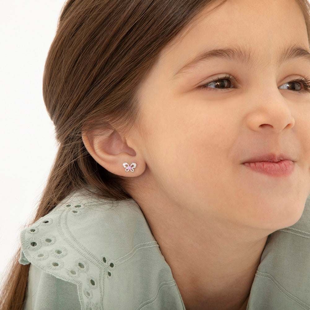 Complete your little girl's jewelry collection with these adorable open butterfly safety screw back earrings. Crafted from 925 sterling silver and adorned with clear and pink cubic zirconias, these earrings add a cute touch to any outfit. Ideal for kids with sensitive ears, these sterling silver earrings make a lasting and wonderful gift. The fun butterfly design is sure to bring smiles over and over again. With safety screw back closures for toddlers, these earrings provide comfort and security, making them an excellent choice for birthdays or special occasions. A gift box is included for added charm.