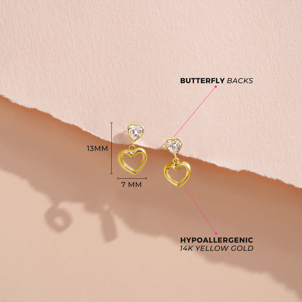 14k Gold Heart to Heart CZ Dangle Kids / Teen Earrings
