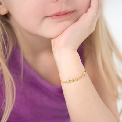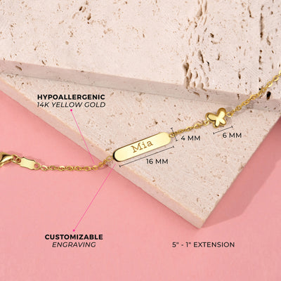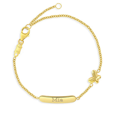 Looking for a special gift for a little girl? Our 14k yellow gold engravable bracelet is the a sweet choice. Featuring a polished puffed butterfly charm, this playful bracelet is sure to delight any young girl. Measuring 5 inches with an additional 1-inch extension, it's adjustable for a comfortable fit. The bracelet is crafted from 14k yellow gold, a material that is safe for sensitive skin, and is designed to last for years to come. With the option to add a personalized engraving, this bracelet can be made even more special and unique. Give the gift of beauty and grace with our engravable butterfly bracelet. Gift box included with purchase.