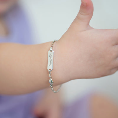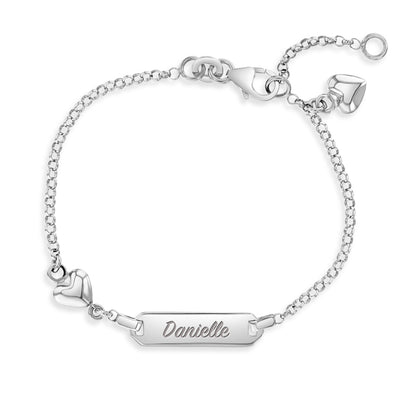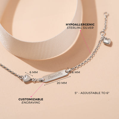 This customized ID plate charm with cute little hearts makes this girl bracelet unique and elegant. Our adorable identification tag bracelet is crafted in sterling silver which is suitable for those with sensitive skin. Order one today and we'll neatly package this ID bracelet into its own lovely little gift box for your convenience.