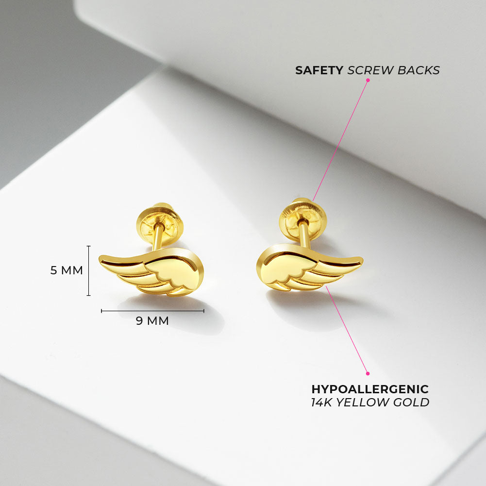 These beautiful angel wings screw back earrings make for a great religious gift for a young girls special communion. Entirely crafted in 14k yellow gold, these cross earrings are great for girls with sensitive ears. These also have safety screw backs, which will bring comfort and security to your little girls all day and night. A complimentary gift box is included.