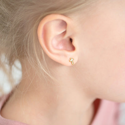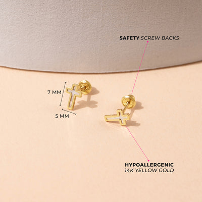 Discover the divine beauty of these girls' religious cross-shaped safety screw back earrings. Delicately designed, each cross boasts a mesmerizing mother of pearl at its core, radiating a gentle iridescence. Crafted from 14k yellow gold, these earrings embody elegance and grace. With their secure screw back closures, they ensure both comfort and peace of mind. Embrace her faith with these enchanting earrings. Gift Box included with purchase.