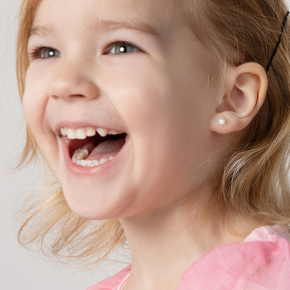 These classic freshwater cultured pearl pearl earrings come in 3mm, 4mm, and 5mm, making them perfect for babies, toddlers, and young girls. They are entirely crafted in 925 sterling silver, a naturally hypoallergenic fine metal, with a rhodium plating for a long, tarnish free, lustrous finish. They feature threaded posts and a safety back system to ensure your child's earrings stay comfortably in place. These kids earrings make a perfect gift for any occasion as well as Sunday wear or for ever day fashion. Beautiful gift box included for easy giving!