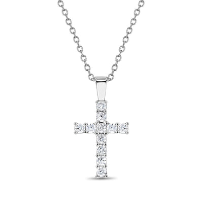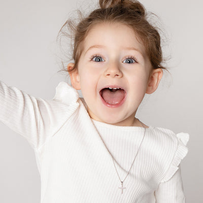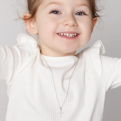 This dazzling cute sterling silver cross necklace for girls is made of 925 sterling silver and has multiple sparkling round cubic zirconias. Makes for an evocative gift on a loved ones special day whether it be their First Holy Baptism, Christening, First Holy Communion, First Reconciliation or Confirmation. A matching chain is included. Packed carefully in a beautiful gift box.