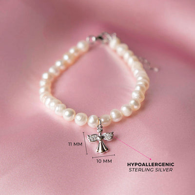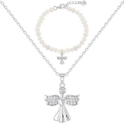 Celebrate her religious special occasion by gifting her with this special angelic jewelry set. This beautiful set is the perfect addition to her jewelry collection, and will add a classic detailing to her special day. Included in this set is a beautiful angel pendant necklace with clear cubic zirconia stones with a matching bracelet created from freshwater cultured pearls. This stunning pendant includes a matching 16" chain. Packed into a cute box for easy gifting.