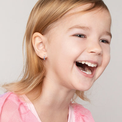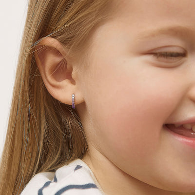 Add a splash of color to your favorite girl's jewelry collection with these lovely silver huggie hoop earrings for girls. These tiny classic design features pave cubic zirconias that will make her ears sparkle and compliment her outfits. These kids hoop earrings were designed to open easily on a hinge and snap firmly back into place securely and safely. They are crafted in 925 sterling silver, making them naturally hypoallergenic and suitable for girls with sensitive ears. This item will arrive neatly packaged in a gift box for your convenience and easy gift giving.