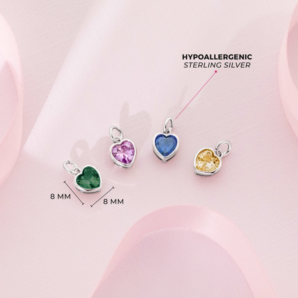 Looking for a unique birthday gift to give to the special young girl in your life? A pretty heart shaped charm that can easily be added to her favorite bracelet. Featuring a unique way of displaying her birth month that she will be able to treasure forever. This beautifully designed charm features a small simulated birthstone created from a bright cubic zirconia stone. This stunning charm glistens with every glimmer of light adding a fun and vibrant touch to her favorite charm bracelet. A gift box is included with your purchase for easy gifting.