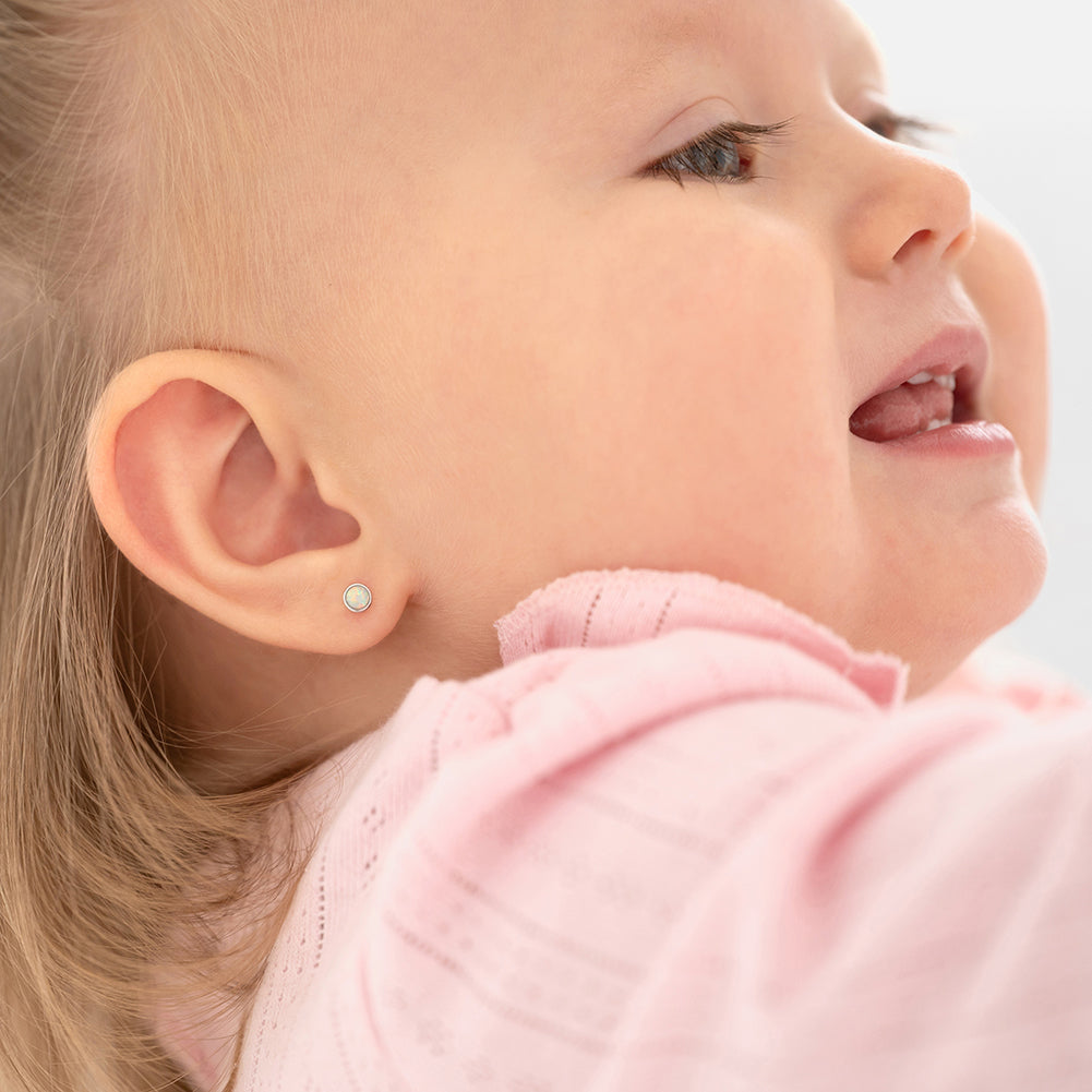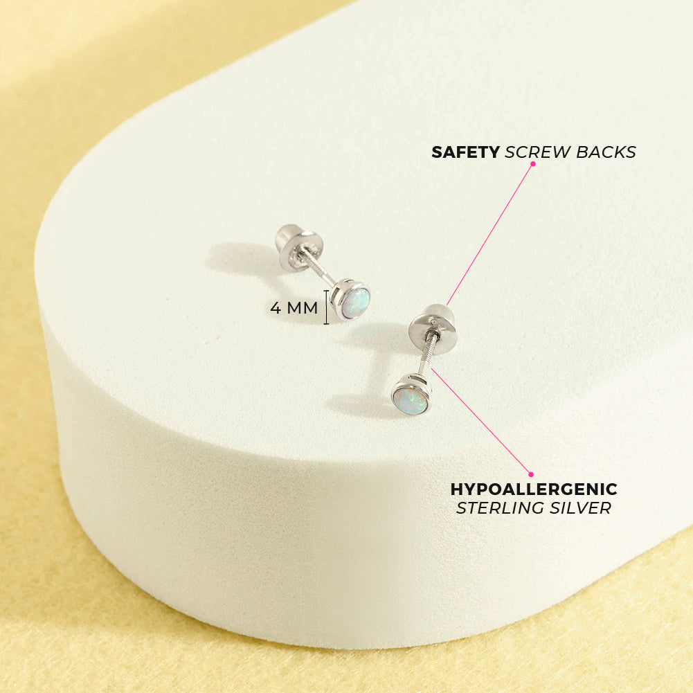 Elevate your little girl's elegance with these darling bezel earrings. Each earring features a small simulated opal stone delicately set in a bezel setting, exuding timeless charm. Crafted from hypoallergenic 925 sterling silver, they offer a safe and comfortable option for young girls with sensitive ears. With safety screw back closures, these earrings ensure a secure fit, providing peace of mind. For adding a touch of sophistication. A small gift box is included with purchase.