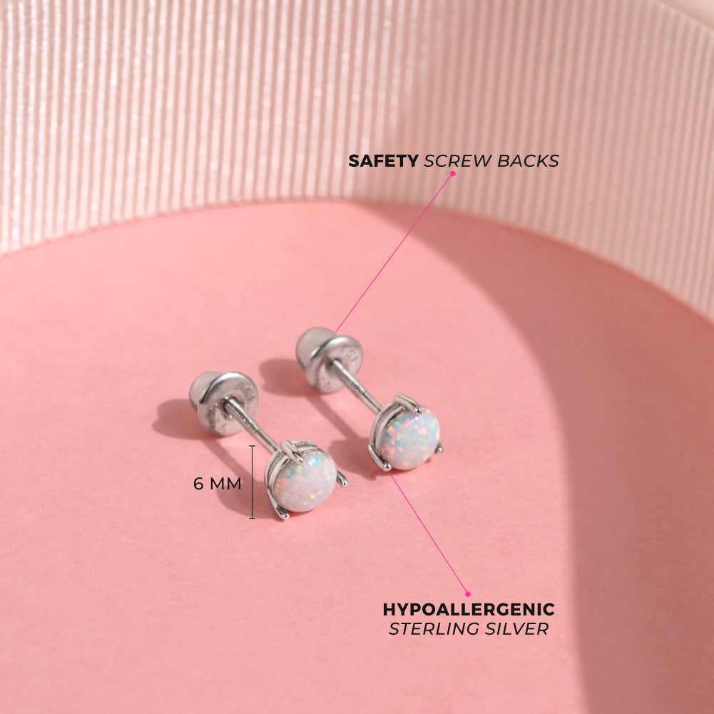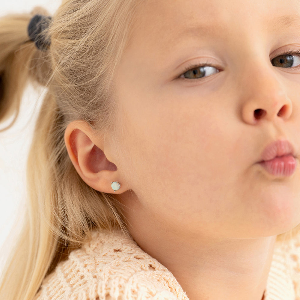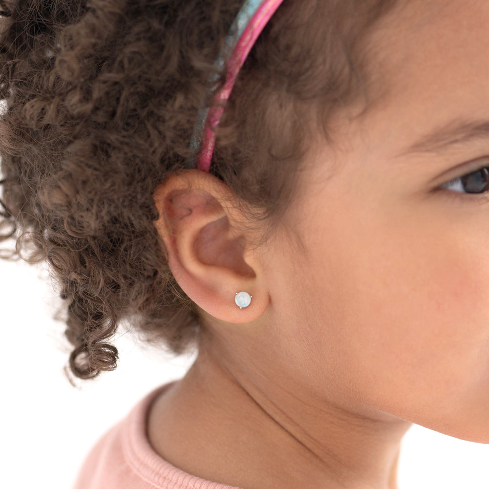 These delicate round-shaped simulated opal earrings are an elegant accessory for any child. Set in a secure three-pronged design, the earrings are crafted from hypoallergenic 925 sterling silver, ensuring both durability and comfort for sensitive ears. The safety screw back closures provide a secure and comfortable fit. Combining elegance with safety, these opal earrings allow children to add a touch of sparkle to their look with confidence. A small gift box is included with purchase of these simulated opal stone earrings.