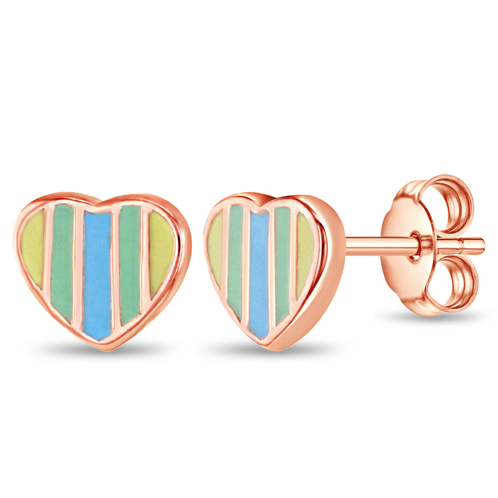 Any teen girl will love to receive these unique heart shaped earrings. Vibrant green, yellow and blue enamel stripes accentuate the features of these beautiful heart earrings. Crafted with a 925 sterling silver and flashed in Rose Gold, these fun studded earrings are the perfect accessory for a teen girl. Gift box is included with your purchase for easy gifting.