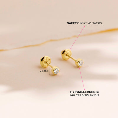 Our bezel set diamond earrings are the sweetest accessory for baby girls. Crafted from high-quality 14k yellow gold, these earrings are safe for sensitive skin. The small diamond at the center of each earring adds just the right amount of sparkle, making them an elegant choice for any occasion. The screw back closure ensures that the earrings stay securely in place, making them a practical choice for active babies and toddlers. These earrings are a timeless and beautiful gift that can be treasured for years to come. Give the gift of timeless elegance with our bezel set diamond earrings for baby girls. A small gift box is included with purchase.