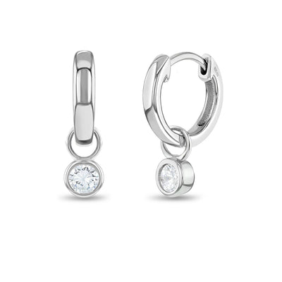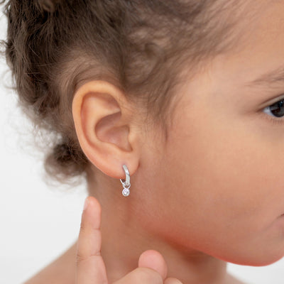Bezel CZ Gem Dangle 9mm Kids / Children's / Girls Earrings Hoop/Huggie Safety Latch - Sterling Silver