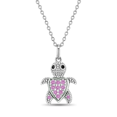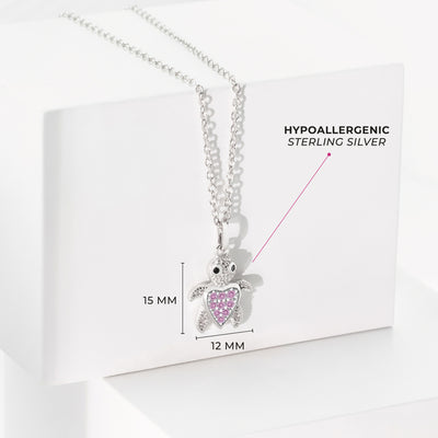 Add an unforgettable detail to your little girls special special beach vacation with this adorable turtle pendant necklace. Her face will light up with an instant smile when she takes a look at this sparkling turtle. Featuring tiny pink and black cubic zirconia stones throughout the entire shell of the turtle, this necklace shines bright with any flash of light. This adorable pendant arrives specially packed in a tiny gift box for easy gifting alongside a matching chain.