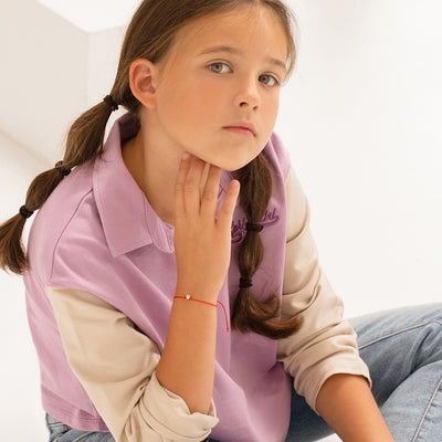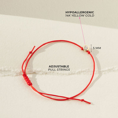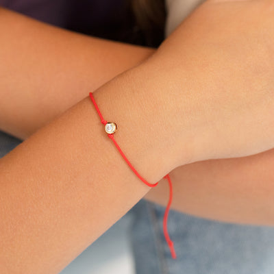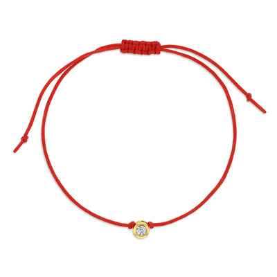 Add a touch of elegance to your little girls jewelry collection with this beautiful red fortune bracelet. Red fortune string bracelets are a symbol of good luck and protection. Adorning this bracelet is a petite round clear cubic zirconia charm that is crafted with 14k yellow gold. This fun red fortune bracelet features a ribbon material that can be adjusted to fit any wrist size and for girls of any age. Stack this beautiful bracelet with your favorite pieces for a cute layered look. Packaged into a sweet gift box for easy gifting.