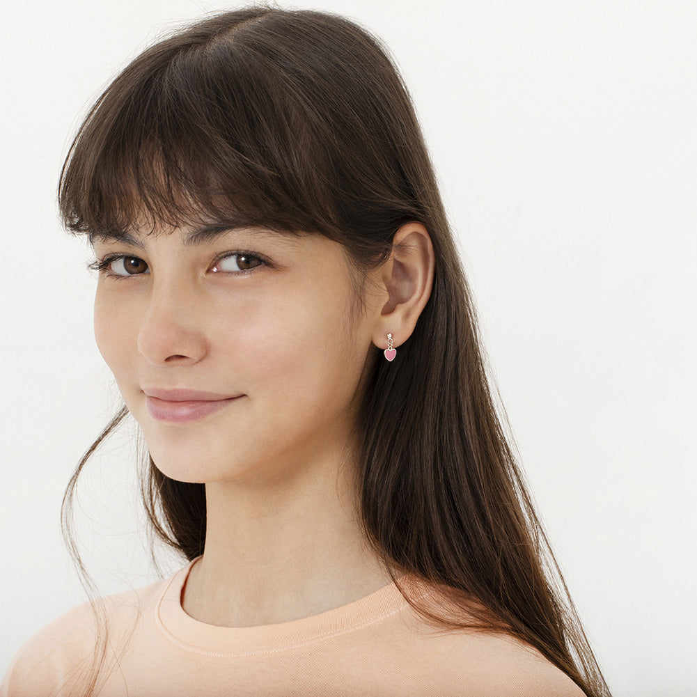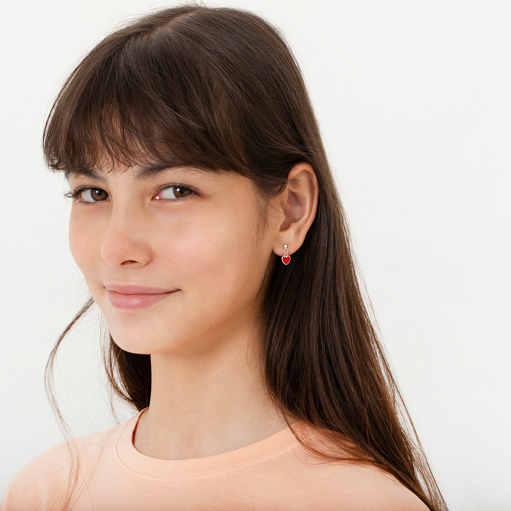 These sweet and simple pair of small dangle enamel heart earrings for little ladies are perfect for everyday use and even special occasions! Finely crafted entirely in 925 sterling silver and enamel, they are hypoallergenic and safe for children with sensitive ears. They feature a threaded earring post and back to ensure your child's earrings stay safely and comfortably in place. A complimentary gift box is included.