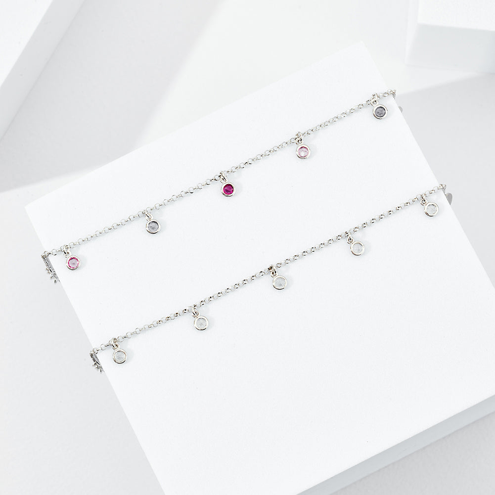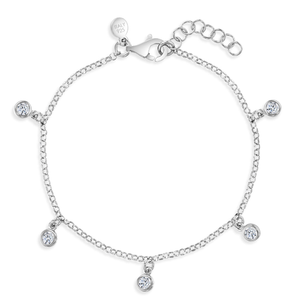 Delicate and enchanting, this dainty bracelet adorns a little girl's wrist with elegance. Crafted from 925 sterling silver, it boasts a hypoallergenic quality, ensuring it's gentle on sensitive skin. The link chain features multiple tiny bezel-set cubic zirconia charms, sparkling delicately as they catch the light. With a length of 6" and an additional 1" extension, this bracelet is designed to grow alongside cherished memories, making it a timeless keepsake for any young girl to treasure. A complimentary gift box is included.
