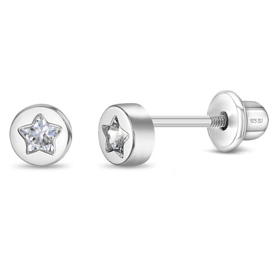 Discover our charming round-shaped earrings for little girls, featuring a tiny clear cubic zirconia star at the center. Crafted from hypoallergenic 925 sterling silver, these earrings are gentle on sensitive skin. The secure screw-back closure ensures they stay safely in place, making them for everyday wear or special occasions. With their sparkling star design and comfortable fit, these earrings add a touch of magic to any outfit. Gift box included.