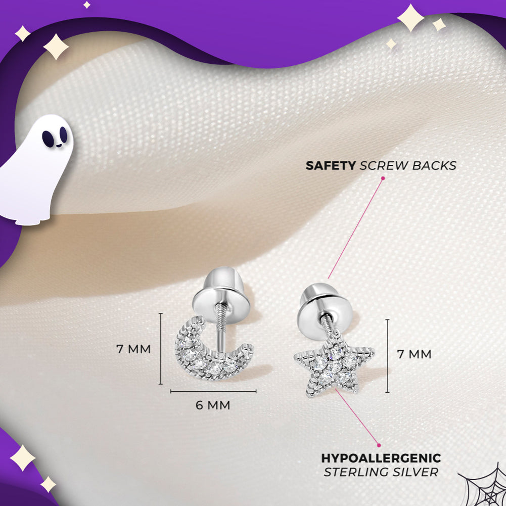 Embrace the enchanting spirit of Halloween with these exquisitely crafted celestial earrings. Perfect for adding a touch of mystique to your spooky ensemble or as a bewitching gift for the starry-eyed in your home. Crafted with meticulous care, our clear cubic zirconia moon and star screw-back earrings are cast in 925 sterling silver for an extra layer of comfort and security that's as reliable as a protective spell. Whether you're conjuring up a casual or formal look, these celestial adornments will elevate your style. Little witches and wizards will love these moon and star earrings for kids, sure to cast a spell of admiration among their friends.