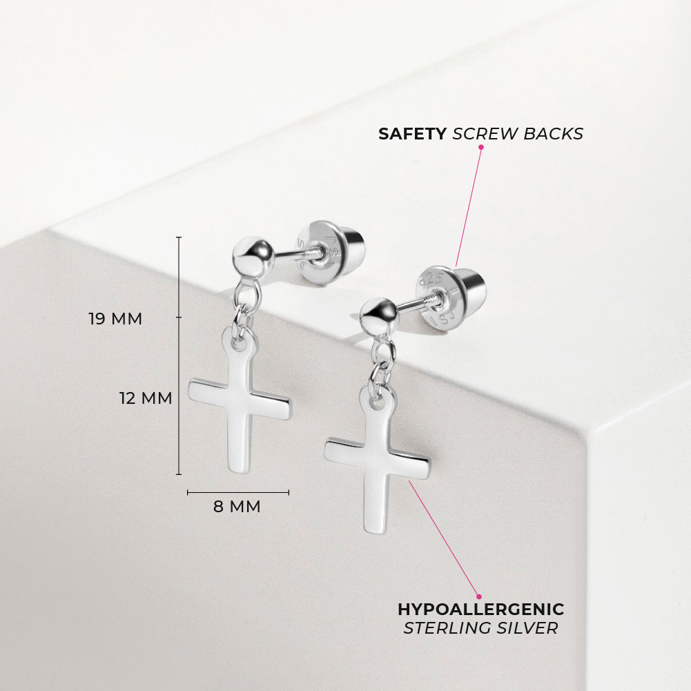 These cross dangle earrings are sure to become your little girls favorite pair of religious earrings. Crafted entirely in 925 sterling silver, they are hypoallergenic and safe for children with sensitive ears.They feature a threaded earring post and back to ensure your child's earrings stay safely and comfortably in place. A complimentary gift box is included.