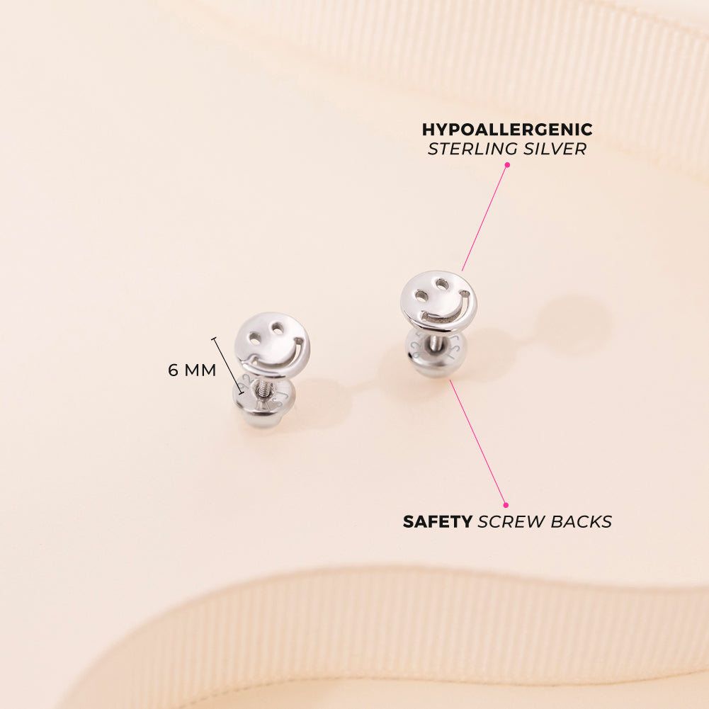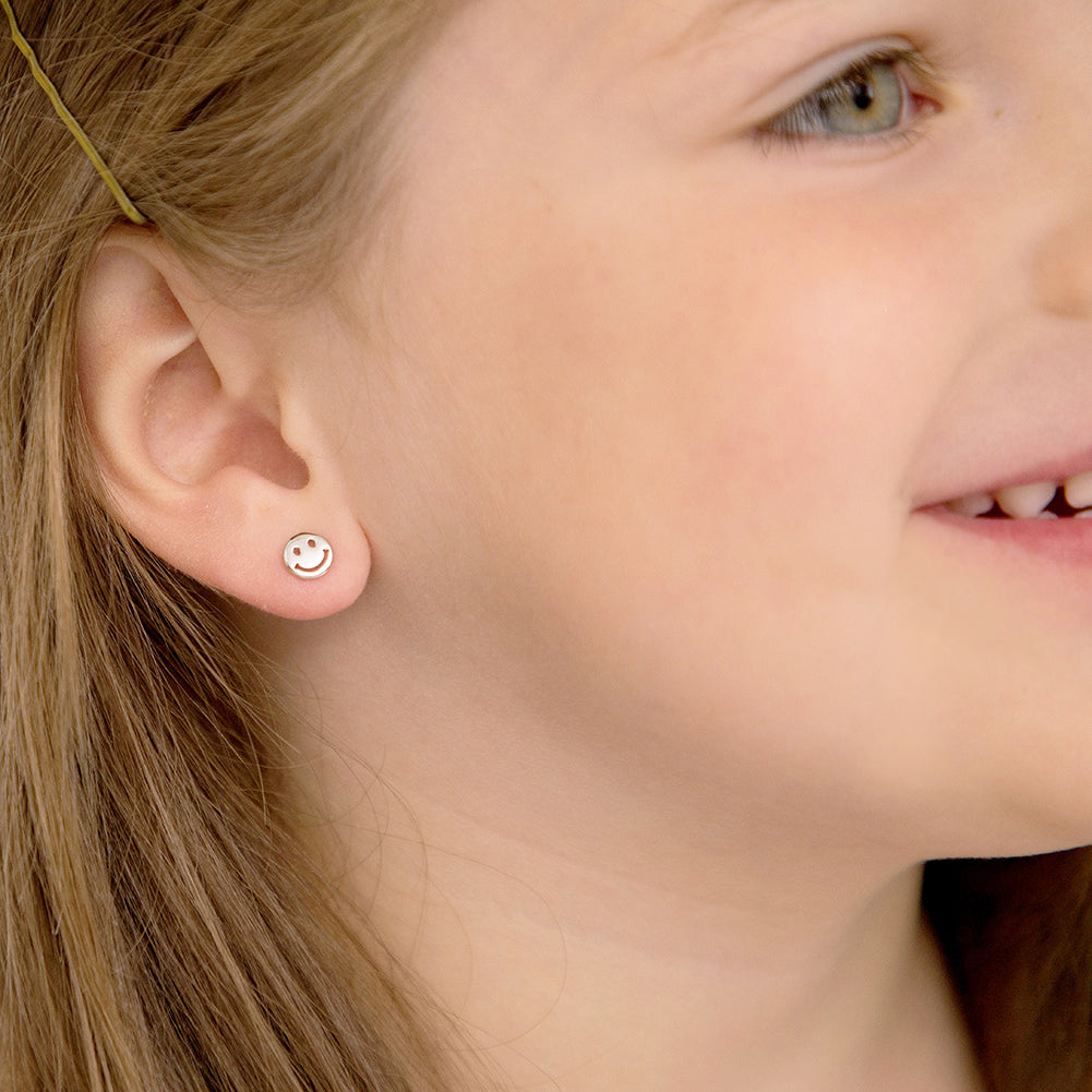 A pair of earrings that will immediately add a smile to your little girls face. These happy earrings feature a fun smiling face that will brighten up any girls day. These beautiful smile earrings include safety screw backs, that allow the earrings to remain safely in place. Gift Box included with purchase.