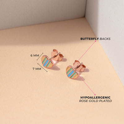 Any teen girl will love to receive these unique heart shaped earrings. Vibrant green, yellow and blue enamel stripes accentuate the features of these beautiful heart earrings. Crafted with a 925 sterling silver and flashed in Rose Gold, these fun studded earrings are the perfect accessory for a teen girl. Gift box is included with your purchase for easy gifting.
