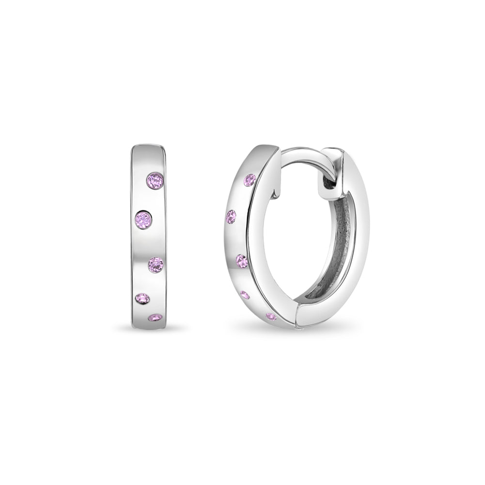 Add a pretty pop of color to your little girl's look with this pair of small sterling silver huggie hoop earrings with cubic zirconias. These CZ small huggie hoops are the perfect choice for children's jewelry gifts or everyday silver earrings. They are designed to open easily on a hinge and snap firmly back into place, enabling them to fit very securely. A cute gift that will last her a lifetime, packed neatly in a complimentary gift box.