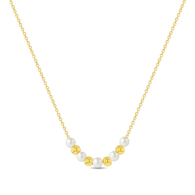 A delicate link chain necklace that is beautifully adorned with small freshwater cultured pearls stranded with polished balls within. Any little girl will love to receive this adorable necklace to wear to formal occasions or for daily wear. This beautiful necklace is crafted from 14k yellow gold, and it is great for girls with sensitive skin. Gift box is included with purchase.