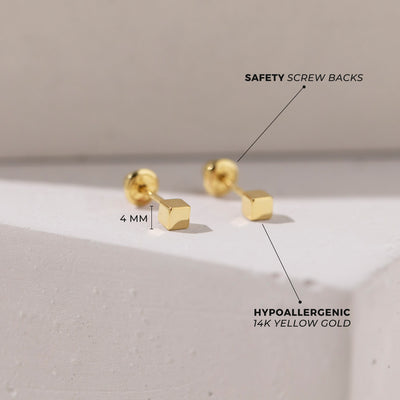 A chic luxury with our collection of 14k gold tiny square cubed earrings designed for women. Crafted with care, these earrings exude understated elegance and contemporary flair. The 14k gold setting perfectly complements the petite square cubes, resulting in a look that's both charming and stylish. Embrace the essence of modern femininity as you adorn yourself with these exquisite earrings.