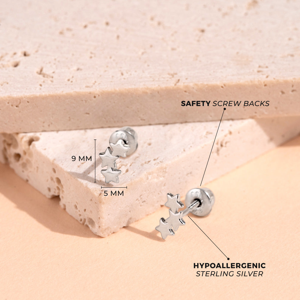 Presenting our exquisite women's climber earrings, designed in the shape of three stars that elegantly ascend along the ear. These earrings are crafted from 925 sterling silver, a hypoallergenic material that ensures they are safe for sensitive ears. The screw back closure is thoughtfully included to provide a secure fit without causing discomfort. Inspired by the beauty and mystery of the night sky, these star-studded earrings capture the allure of the cosmos, making them a perfect accessory for stargazers and those who find magic in the celestial wonders above. Add a touch of stellar elegance to your look and let these climber earrings shine as brightly as the stars themselves.