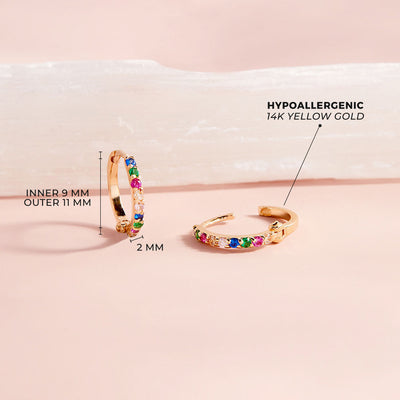 Experience the captivating charm of our 14k Gold Prismatic Rainbow Colored Cubic Zirconia Hoop Earrings, specially designed for women with an eye for exquisite jewelry. These stunning hoops boast a symphony of colors that dance in the light, making them a perfect accessory to elevate your style. Crafted with precision and care, the 14k gold setting adds a touch of luxury to these vibrant earrings. Embrace the spectrum of hues and indulge in a truly mesmerizing addition to your jewelry collection.