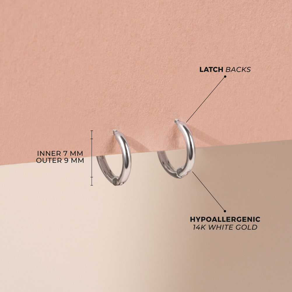 Experience the charm of our 14k white gold mini 7mm hoop earrings specially designed for women. These dainty hoop earrings, measuring just 7mm, are perfect for extra piercings. Crafted with precision from 14k white gold, they offer a delicate yet radiant accessory that effortlessly complements any outfit. Whether worn alone or paired with other earrings, these tiny hoops add a subtle touch of sophistication.