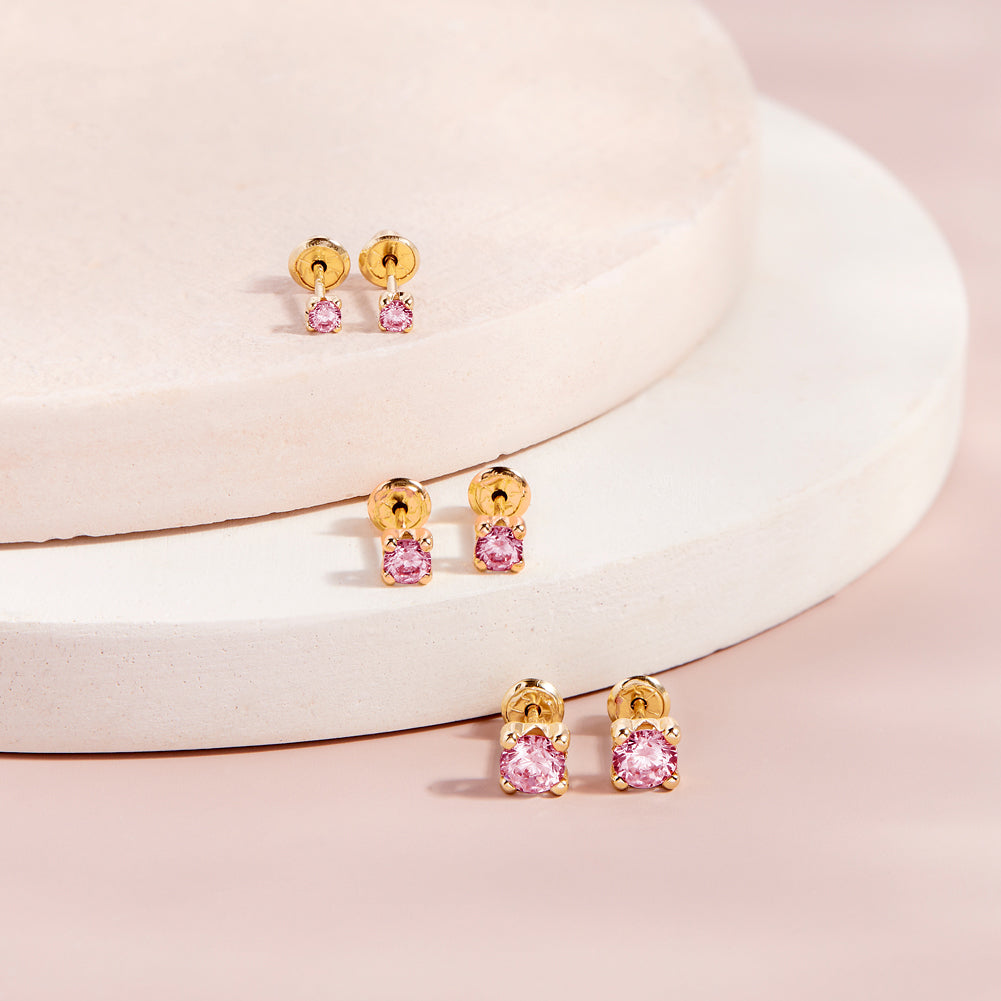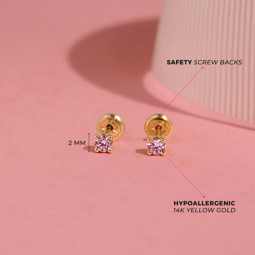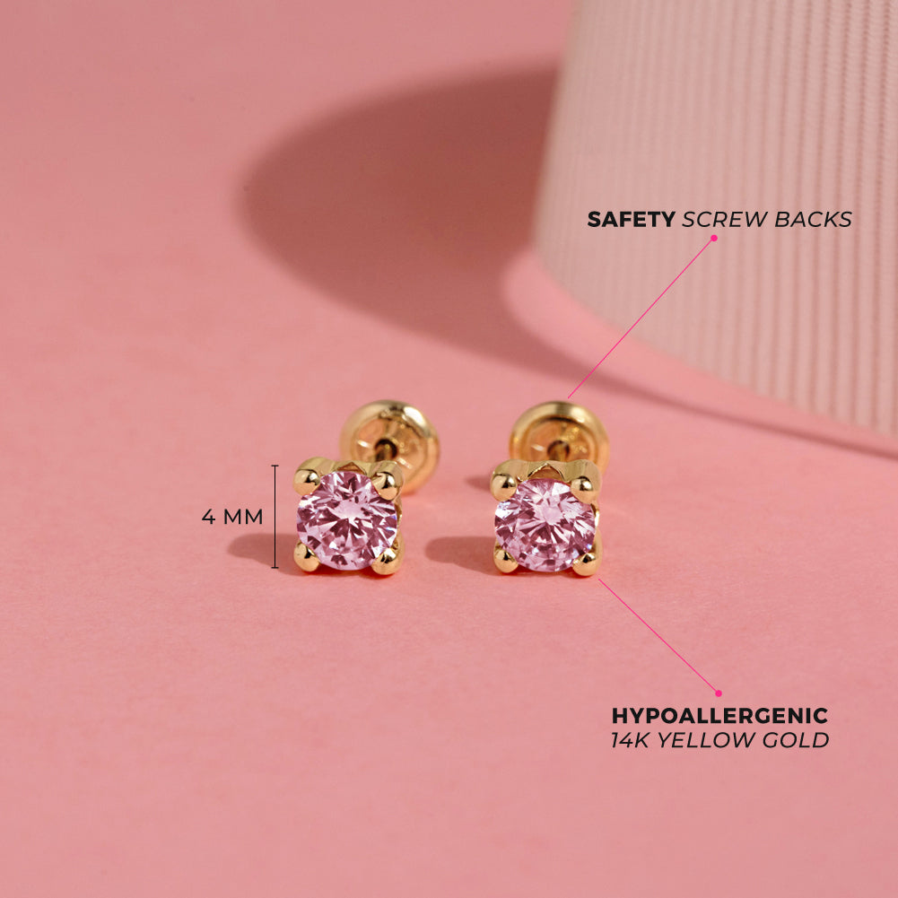 These beautiful prong set cubic zirconia earrings were crafted in 14k yellow gold, a precious material which is suitable for babies and little girls with sensitive ears. High polished for long lasting shininess and durable quality, these classic and timeless earrings for girls come with screw backs which is a safety back that screws on and locks thus preventing for any poking in the back of the earlobe and lessening chances of lost earrings. Gift box included.