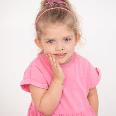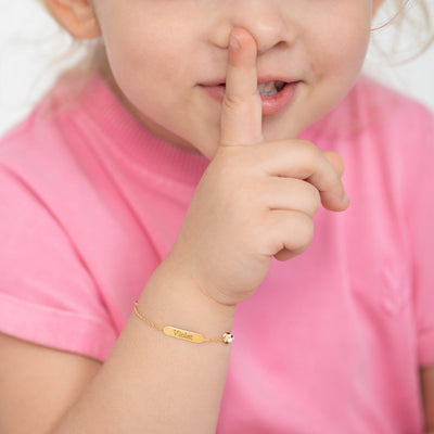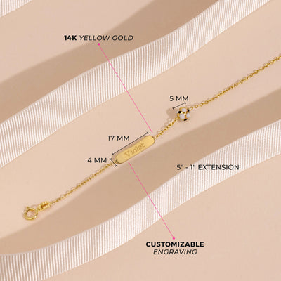 Our adorable little girl's engravable tag identification bracelet, is a blend of personalization and playful charm. Crafted from hypoallergenic 14k yellow gold, this bracelet features a customizable tag that can feature their name or a special message. Adorned with a petite enamel soccer ball, it adds a playful charm to your sporty little girl. With a length of 5 inches and a 1-inch extension, it grows with your little athlete. Whether for daily wear or special occasions, this bracelet offers both style and safety. Give your child a precious keepsake to cherish forever.