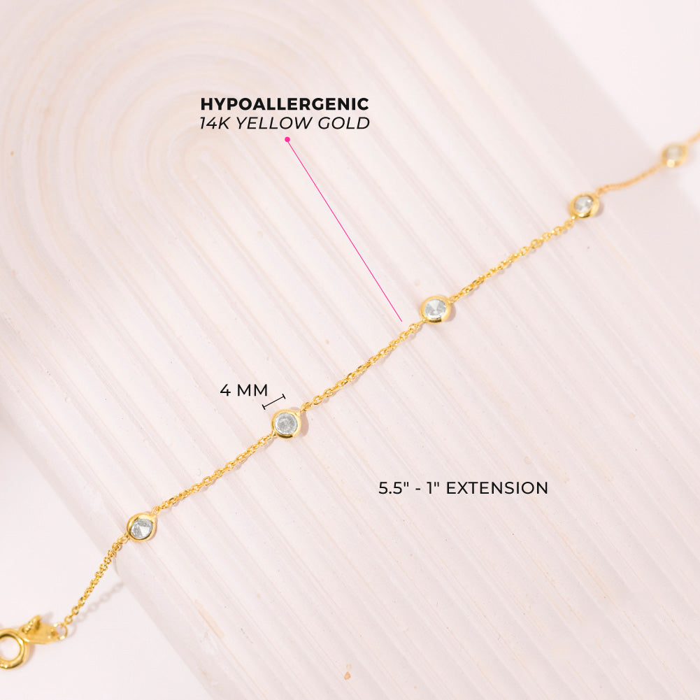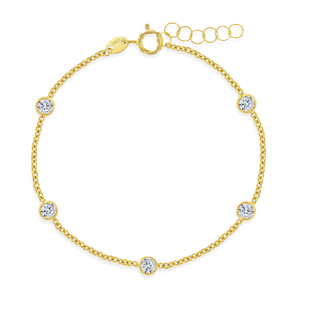 Glimmer with this adorable cz bracelet! This 14k gold bracelet is a stunning piece of jewelry that measures 5.5 inches and can be extended to 6.5, making it a great size for a smaller wrist. The bracelet is made from high-quality 14k gold, which adds to its durability and value, making it safe for babies with sensitive skin. It is adorned with clear cubic zirconias that are carefully set into the gold to create a beautiful sparkle that catches the light from all angles. The cubic zirconias are a stunning addition to the bracelet, adding a touch of elegance and sophistication to the piece. Whether you wear it to a special occasion or just to add a bit of sparkle to your everyday look, this bracelet is sure to turn heads and make a statement. Gift box included.