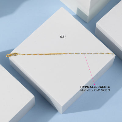 Introducing our timeless Figaro link chain bracelet, the classic accessory suitable for baby boys. With a lengths available of 5.5 & 6.5 inches, this bracelet is meticulously crafted from 14k yellow gold, ensuring safety for even the most sensitive baby skin. The Figaro link chain design exudes a sense of classic elegance, adding a touch of sophistication to any little one's outfit. Built with durability and meticulous attention to detail, this bracelet is meant to withstand the test of time and can be cherished for generations to come. Whether it's a christening, birthday, or any special occasion, this bracelet makes for a truly timeless gift. Plus, we include a gift box to make your presentation even more special.