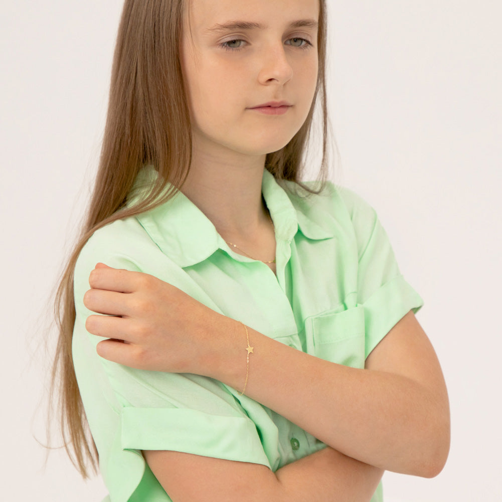 This 14k gold single polished star bracelet is a charming and elegant piece of jewelry designed for little girls. The star-shaped pendant is beautifully crafted with high-quality gold and polished to a flawless finish, making it a perfect gift for any special occasion. The bracelet measures 6.5 inches and can be extended to 7.5", making it an ideal size for little girls' delicate wrists. The intricate details and craftsmanship of this piece of jewelry make it a valuable addition to any jewelry collection. Its timeless design and classic style make it versatile enough to wear for any occasion. Whether for a birthday, a special holiday, or just because, this gold star bracelet is sure to be treasured for years to come.