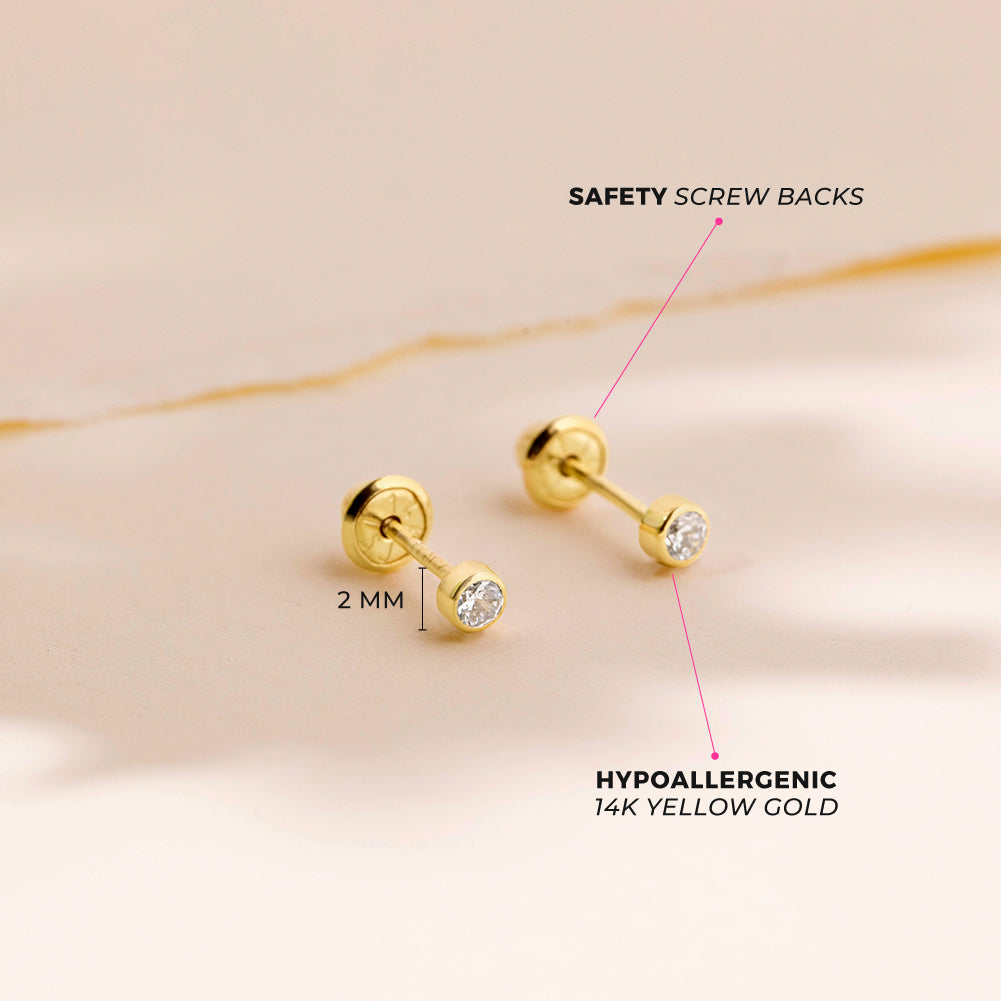 14k Gold Bezel Set Diamond Baby / Toddler / Kids Earrings Safety Screw Back