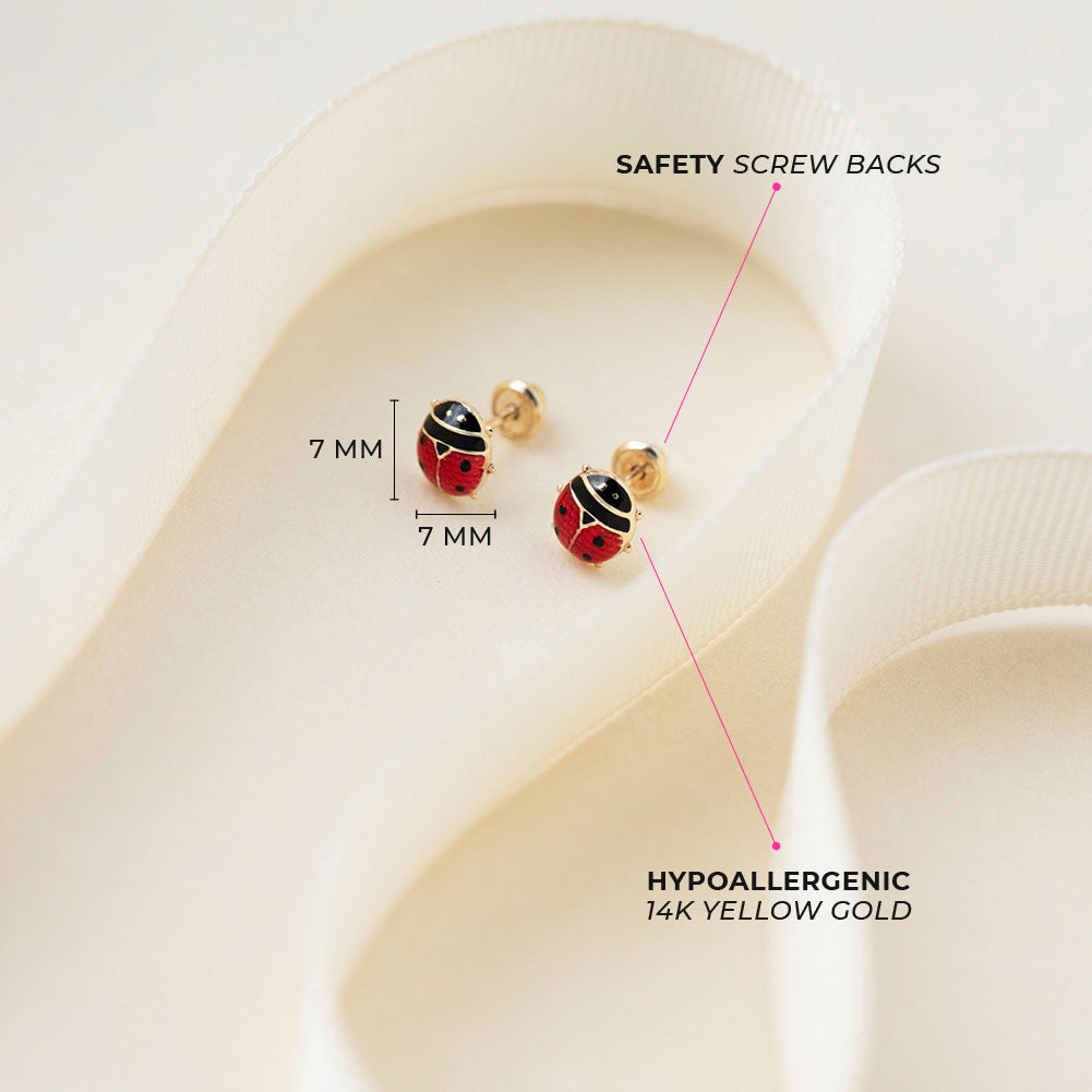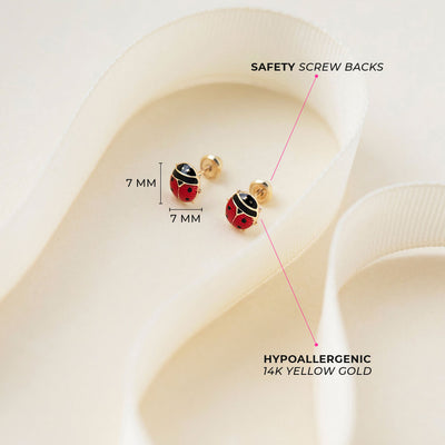 Your little girl will love these beautiful red ladybug screw back earrings. Beautifully colored with red and black enamel which will look stunning and fashionable on her ears. Made from 14k yellow gold, which are suitable for children with sensitive skin. These ladybug earrings also have screw backs that twist on the post for a safe, secure, and comfortable fit. She’ll enjoy everyday with this pair of children’s red enamel ladybug earrings. A complimentary box is included.