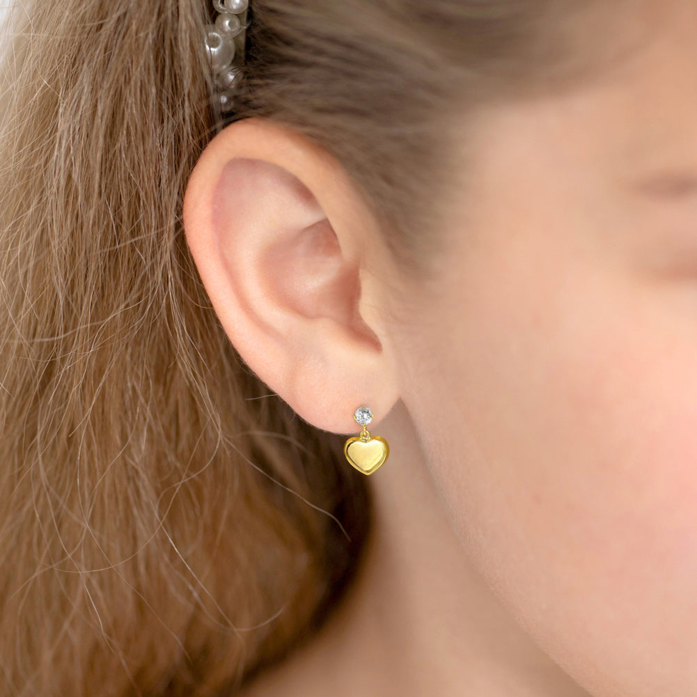 Our adorable small dangle heart earrings, designed to steal hearts with their charming elegance! Crafted from gentle 14k yellow gold, these earrings offer a safe and hypoallergenic option for young girls with sensitive skin. Each earring features a dainty clear cubic zirconia stone atop a beautifully crafted heart dangle, adding a touch of sparkle. With their safety screw back feature they will remain in place alongside their wildest adventures. Elevate your little one's style with these enchanting earrings, ideal for any occasion!