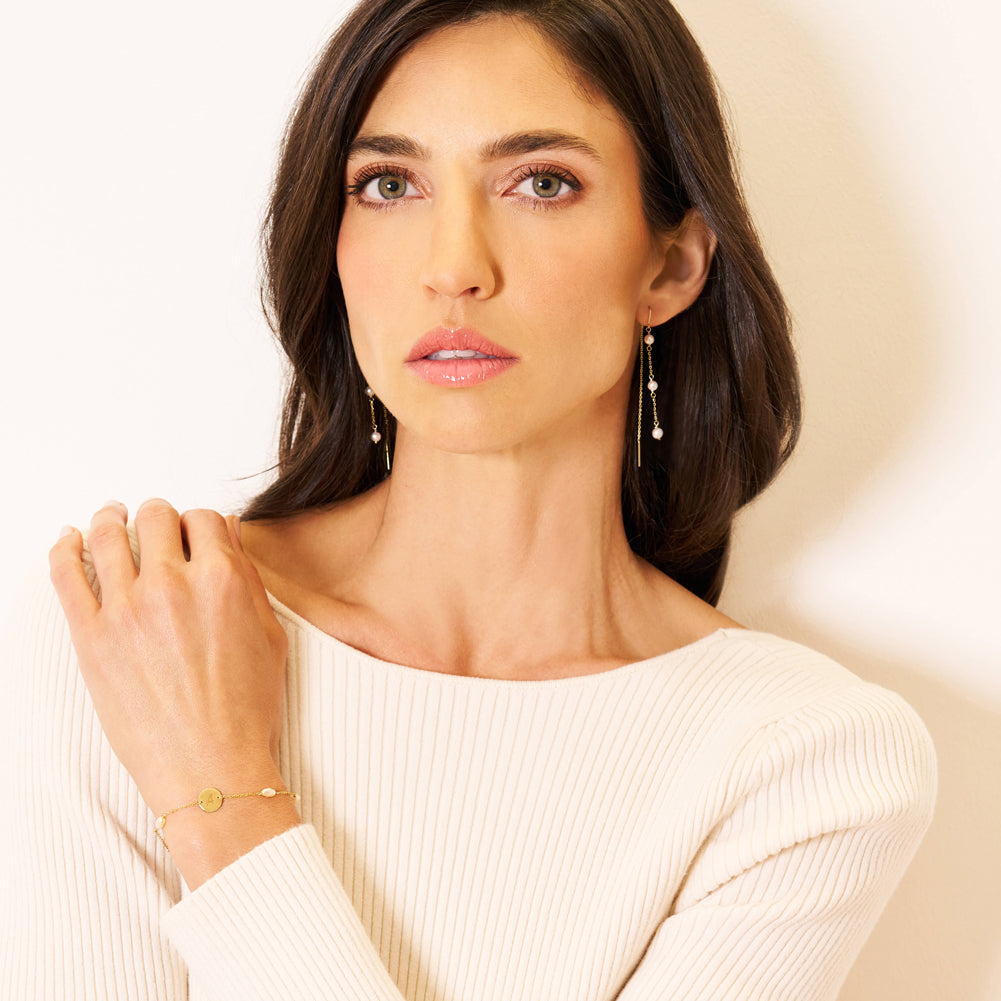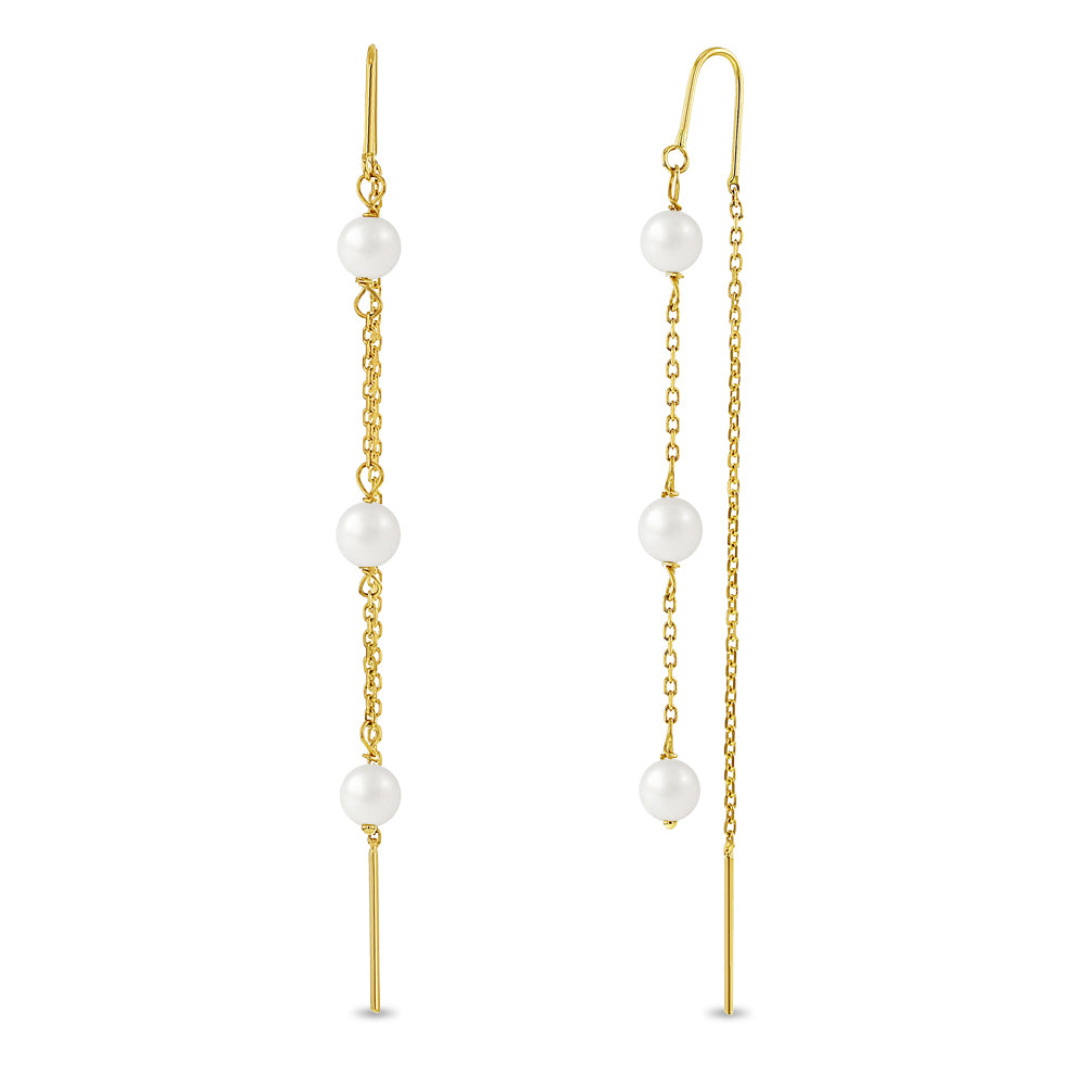 An elegant pair of simulated pearl earrings for a woman to elevate her special occasion. These beautiful stranded simulated pearl earrings dangle elegantly from the ear, offering a timeless and sophisticated look. Crafted from 14k yellow gold, they are safe for women with sensitive ears, ensuring both comfort and style. The lustrous simulated pearls enhance the luxurious design, making these earrings a versatile accessory for any occasion.