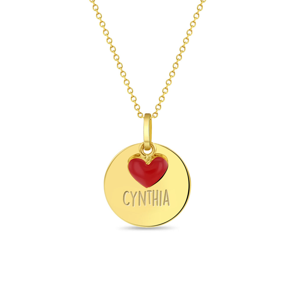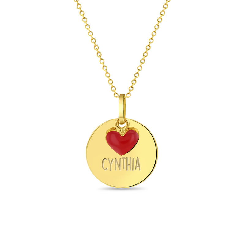 The personalized present of your dreams, this adorable round engravable tag pendant features a vibrant red enamel heart charm that pairs beautifully with the engraved name of your sweet little girl. This round engravable pendant is delicately crafted from 14k yellow gold, therefore it is safe for young girls who have sensitive skin. Matching 12" chain included. This adorable pendant necklace is packaged into a gift box for easy gifting.